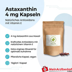 Astaxanthin 4 mg pro Kapsel aus der Alge Haematococcus pluvialis kombiniert mit natürlichem Vitamin E zur antioxidantiven Ergänzung. Formulierung mit extra verginem Olivenöl für verbesserte Aufnahme und einer pflanzlichen Kapselhülle, geeignet für Vegetarier und Veganer. Herkunft: nachhaltig kultiviertes Astaxanthin aus Hawaii.
