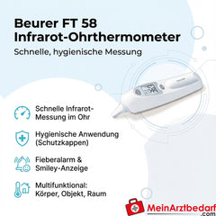 Das Beurer FT 58 Infrarot-Ohrthermometer ermöglicht berührungsarme und sekundenschnelle Messungen der Körpertemperatur im Ohr. Dank wechselbarer Schutzkappen eignet es sich zur hygienischen Nutzung in Familien- und Praxisumgebungen. Zusätzlich misst es Objekt‑ und Raumtemperaturen und speichert Messwerte zur Verlaufskontrolle.