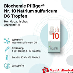 Biochemie Pflüger Nr. 10 Natrium sulfuricum D6 Tropfen sind ein homöopathisches Arzneimittel zur symptomunterstützenden Anwendung. Das Präparat enthält den Wirkstoff Natrium sulfuricum D6 in flüssiger Tropfenform und ist geeignet für die kurzzeitige Anwendung nach den Anweisungen der Packungsbeilage.