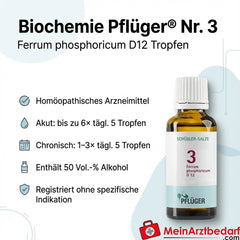 Lieferumfang: 1 Flasche Biochemie Pflüger® Nr. 3 Ferrum phosphoricum D12 Tropfen, 20 ml, flüssig – Hersteller: Biochemie Pflüger