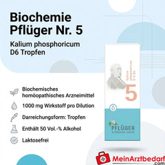 Lieferumfang: 1 Packung Biochemie Pflüger Nr. 5 Kalium phosphoricum D6, 1000 mg, Tropfen – Hersteller: Biochemie Pflüger.