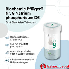 Lieferumfang: 1 Packung Biochemie Pflüger® Nr. 9 Natrium phosphoricum D6 Tabletten, 250 mg pro Tablette, lutsch- oder auflösbare Tabletten – Hersteller: Biochemie Pflüger®.