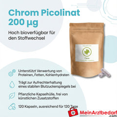 Verzehrempfehlung: 1 Kapsel täglich zu einer Mahlzeit. Enthält 200 µg Chrom pro Kapsel. Nahrungsergänzungsmittel sind kein Ersatz für eine ausgewogene Ernährung und gesunde Lebensweise. Bei Schwangerschaft, Stillzeit, bekannter Erkrankung oder Einnahme von Medikamenten ärztlichen Rat einholen.