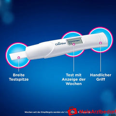 Testdurchführung bereits 5 Tage vor Ausbleiben der Periode möglich (4 Tage vor Fälligkeit). Ergebnis in der Regel nach 3 Minuten; bei positivem Ergebnis folgt direkt die Wochenanzeige (1–2, 2–3 oder 3+ Wochen seit Empfängnis). Test entweder 5 Sekunden im Urinstrahl oder 20 Sekunden in einer Urinprobe anwenden. Ergebnisanzeige bleibt etwa 24 Stunden sichtbar.