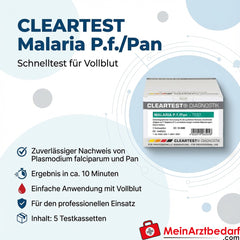 Der Schnelltest Cleartest Malaria P.f./Pan ermöglicht den qualitativen Nachweis von Plasmodium falciparum sowie weiteren Malaria-Erregern (Pan) in menschlichem Vollblut. Ergebnisbereit in ca. 10 Minuten; geeignet für den professionellen Einsatz in Praxis und Labor als zeitsparende Alternative zur Mikroskopie.