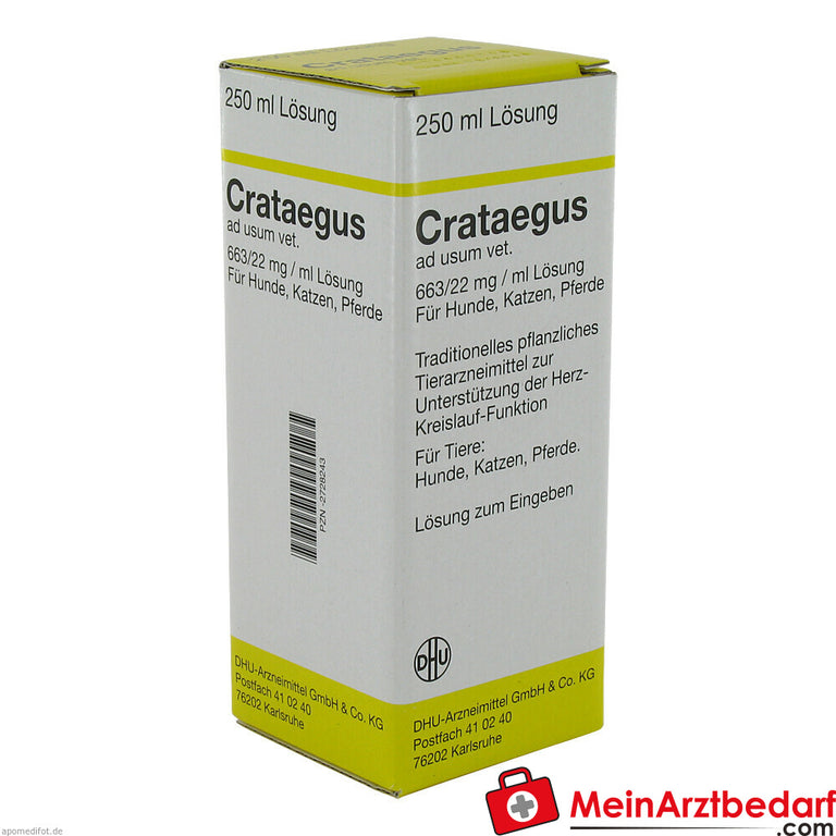 Lieferumfang: 1 Flasche Crataegus ad usum vet Weißdorn‑Extrakt Tropfen 250 ml (flüssig), inkl. Messbecher zur Dosierung.