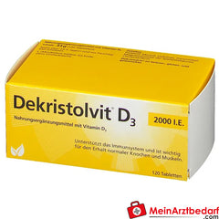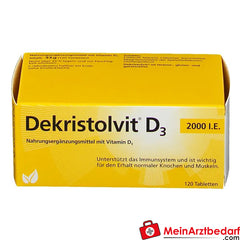 Dekristolvit D3 2000 I.E. Tabletten liefern hochdosiertes Vitamin‑D3 in Tablettenform zur Ergänzung der täglichen Versorgung. Das Präparat dient der Unterstützung von Knochen‑ und Muskelstoffwechsel sowie der normalen Zellteilung und ist für Erwachsene und Kinder ab 11 Jahren vorgesehen. Gluten‑ und laktosefrei, entwickelt und hergestellt in Deutschland.