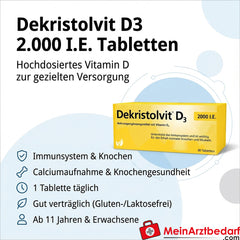 Dekristolvit D3 2.000 I.E. Tabletten liefern hochdosiertes Vitamin D3 zur gezielten Ergänzung bei verminderter körpereigener Vitamin-D-Bildung. Geeignet zur Unterstützung von Immunsystem, Knochenstoffwechsel und Muskelfunktion bei Jugendlichen ab 11 Jahren und Erwachsenen.