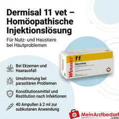 Weravet Dermisal 11 vet ist eine homöopathische Injektionslösung zur unterstützenden Behandlung dermatologischer und konstitutioneller Beschwerden bei Nutztieren, Hunden und Katzen. Indikationen umfassen trockene und nässende Ekzeme, Haarausfall, parasitäre Hautprobleme und Zustände mit auffälligem Körpergeruch; auch als Restitutionsmittel nach Infektionen verwendet.