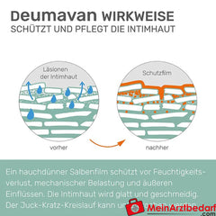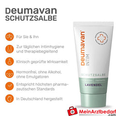 Deumavan® Schutzsalbe Lavendel ist ein Medizinprodukt zur lokalen Anwendung an äußerer Intim- und Analhaut. Die salbenartige, lavendelduftende Rezeptur schützt vor Feuchtigkeitsverlust, unterstützt die natürliche Hautbarriere und lindert Beschwerden wie Brennen und Juckreiz ohne Hormone oder Alkohol.