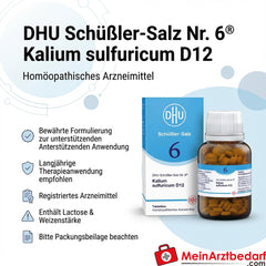 DHU Schüßler-Salz Nr. 6 D12 ist ein registriertes homöopathisches Arzneimittel in Tablettenform mit dem Wirkstoff Kalium sulfuricum in homöopathischer Verdünnung. Es eignet sich zur unterstützenden Anwendung im Rahmen homöopathischer Therapiekonzepte und wird aufgrund langjähriger Anwendung eingesetzt. Enthält Lactose und Weizenstärke.