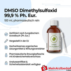 DMSO 99,9 % (Dimethylsulfoxid) in pharmazeutischer Reinheit (Ph. Eur.), hergestellt in der EU und abgefüllt in einer pharmazeutischen Braunglasflasche mit Kindersicherheitsverschluss. Vielseitiges organisches Lösungsmittel und Wirkungsverstärker für Laboranwendungen und industrielle Prozesse.