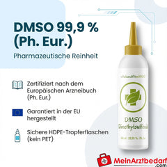 DMSO Dimethylsulfoxid 99,9 % (Ph. Eur.) ist ein pharmazeutisch reines Lösungsmittel und Wirkungsverstärker, zertifiziert nach dem Europäischen Arzneibuch. Geeignet für Laboranwendungen, Formulierungen und technische Einsatzbereiche ; hergestellt und abgefüllt in der EU.