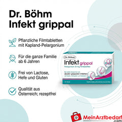 Die ersten Erkältungssymptome machen sich bemerkbar. Es kratzt im Hals, die Nase beginnt zu rinnen. Jetzt gilt Husten, Heiserkeit und Schnupfen behandeln, bevor es zu spät ist und sich die Symptome verstärken. Hausmittel bei Erkältung oder pflanzliche Medikamente bei grippalen Infekten sind daher sehr gefragt. Das Expertenteam von Dr. Böhm hat aus diesem Grund Dr. Böhm Infekt grippal Pelargonium entwickelt. Das pflanzliche Arzneimittel enthält den optimal dosierten Extrakt der Kapland-Pelargonie und kommt bei ersten Anzeichen von akuten grippalen Infekten (Erkältungskrankheiten) mit Symptomen wie Husten, Schnupfen, Heiserkeit zum Einsatz. Die hochwertigen Filmtabletten sind bereits für Kinder ab 6 Jahren geeignet. Damit bietet Dr. Böhm Infekt grippal Pelargonium natürliche Erste Hilfe bei grippalen Infekten für die ganze Familie.
