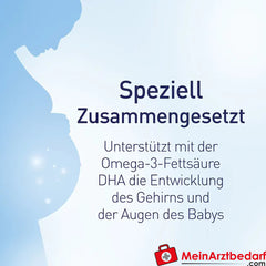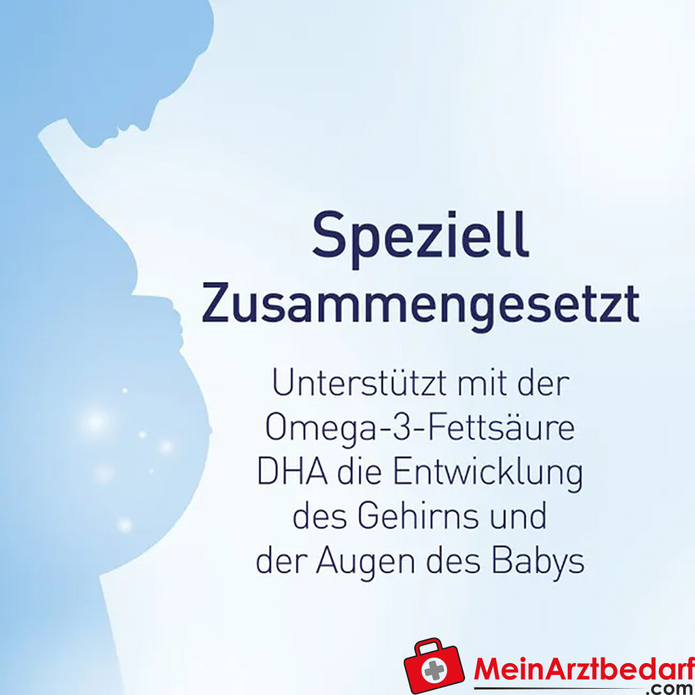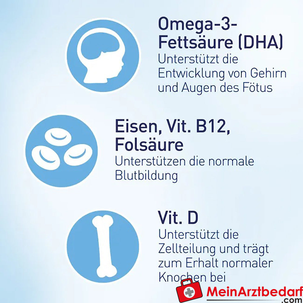 Gezielt entwickelt für Schwangere ab der 13. Schwangerschaftswoche zur ergänzenden Versorgung mit Omega‑3‑Fettsäuren, Vitaminen und Mineralstoffen. Unterstützt die normale Entwicklung von Gehirn und Augen des Fötus durch DHA und liefert zusätzlich Folsäure, Eisen, Vitamin D sowie weitere Nährstoffe.