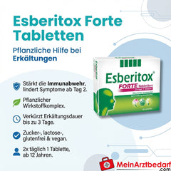 Esberitox forte ist ein pflanzliches Arzneimittel zur unterstützenden Behandlung und zur Vorbeugung von wiederkehrenden Erkältungskrankheiten im Bereich der oberen Atemwege. Dieses Arzneimittel wird angewendet bei Erwachsenen und Jugendlichen ab 12 Jahren. Wenn Sie sich nach 10 Tagen nicht besser oder gar schlechter fühlen wenden Sie sich an Ihren Arzt.