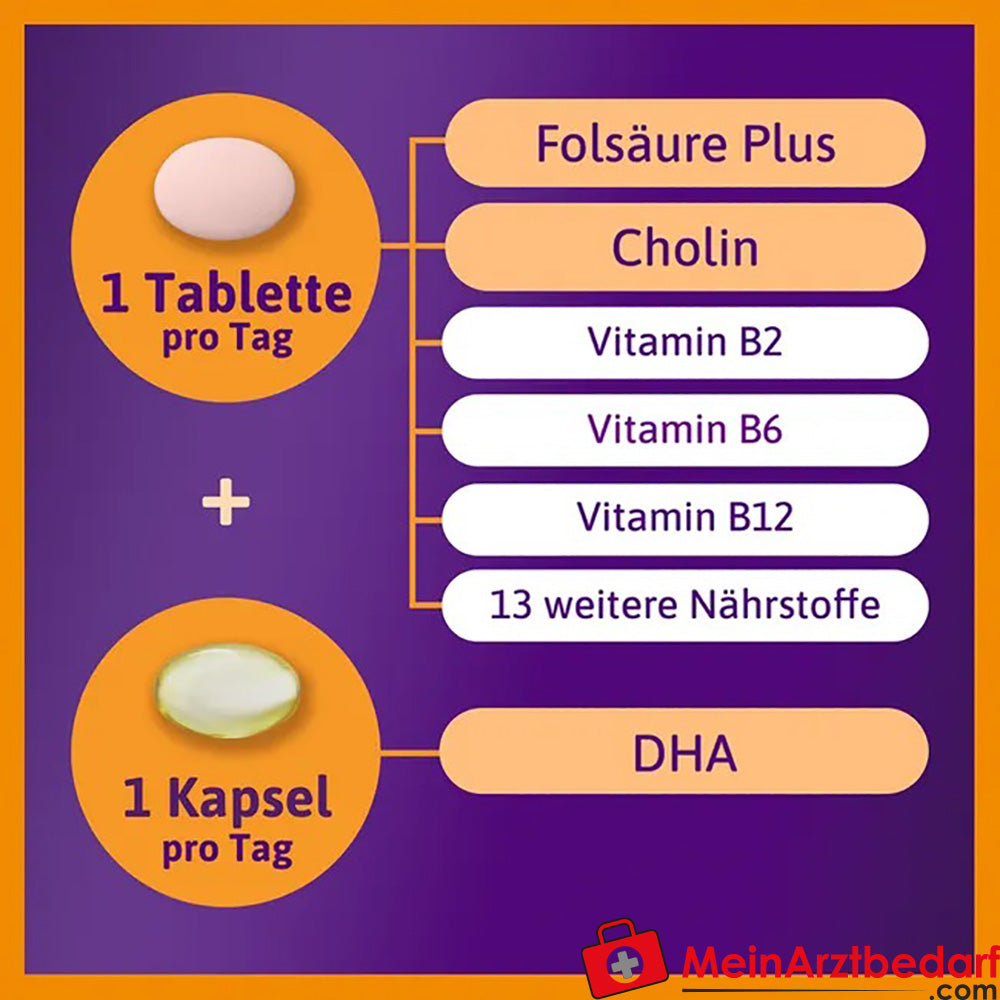 Einmal täglich eine Tablette unzerkaut mit etwas Flüssigkeit einnehmen. Anwendung empfohlen ab Woche 13 bis zur Geburt. Nahrungsergänzungsmittel sind kein Ersatz für eine abwechslungsreiche, ausgewogene Ernährung und gesunde Lebensweise.