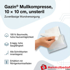 Lieferumfang: 100 Stück Gazin® Mullkompresse 10 × 10 cm, unsteril, 8-lagig – Hersteller: Gazin®