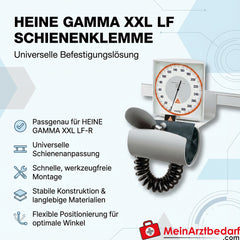 Schienenklemme zur sicheren, platzsparenden Befestigung des HEINE GAMMA XXL LF‑R Blutdruckmessgeräts an medizinischen Schienensystemen. Entwickelt für den klinischen Alltag mit schneller, werkzeugfreier Montage und robuster Bauweise.