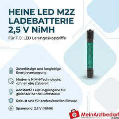 Die HEINE LED M2Z Ladebatterie 2,5 V NiMH liefert zuverlässige, gleichbleibende Energie für F.O. LED Laryngoskopgriffe in Praxis und Klinik. Kompakte Bauform und NiMH-Technologie sorgen für schnelle Einsatzbereitschaft und konstante Lichtleistung während diagnostischer Maßnahmen.