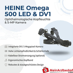 Die HEINE Omega 500 LED Kopfleuchte mit integrierter DV1 5‑Megapixel‑Kamera liefert hochauflösende Bildaufnahmen für präzise ophthalmologische Befunde und Dokumentation in Praxis und Klinik . Robuste Bauweise, kabellose Stromoption und direkte Bildanzeige erleichtern Untersuchungen und Dokumentation.