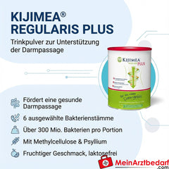 Kijimea® Regularis Plus ist ein aromatisiertes Trinkpulver zur Unterstützung der Darmpassage und zur Förderung einer regulären Verdauung. Die Kombination aus 6 ausgewählten Bakterienstämmen, hochreiner Methylcellulose und hochwertigen Psyllium-Fasern unterstützt die tägliche Darmfunktion. Geschmack: fruchtig; laktosefrei.