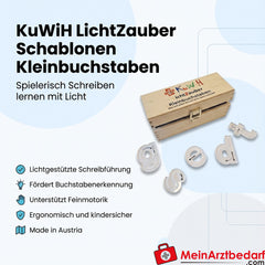 Spielerisches Schreiben lernen mit dem KuWiH LichtZauber Schablonen-Set für Kleinbuchstaben. Die Schablonen führen kindgerecht zu korrekter Schreibrichtung und Stifthaltung, fördern Buchstabenerkennung, Wortbildung sowie Feinmotorik und sind für Kindergarten, Vorschule und schulische Förderstunden geeignet.