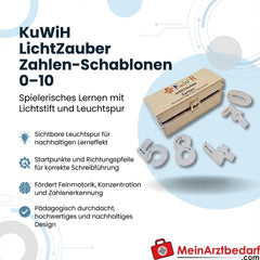 Sensorisches Lernset zum spielerischen Erlernen der Zahlen 0–10 für Vorschulkinder und Schulanfänger. Die Schablonen arbeiten mit einem Lichtstift auf dem KuWiH Licht-Tablet und unterstützen Zahlenerkennung, Schreibführung und Feinmotorik.