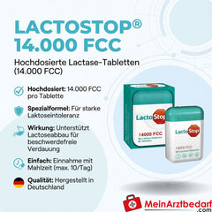 LactoStop 14.000 FCC sind Tabletten mit hoch dosiertem Lactase-Enzym zur Unterstützung des Lactoseabbaus bei Menschen mit starker Laktoseintoleranz. Einfache Einnahme zu lactosehaltigen Mahlzeiten; fördert verträglichere Verdauung ohne gesundheitsbezogene Versprechen.