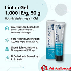 • Lioton Gel 1.000 IE/g, 50 g (Hersteller: MEN04) – hochdosiertes Heparin-Gel zur lokalen Anwendung.
