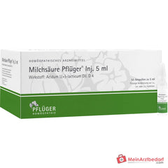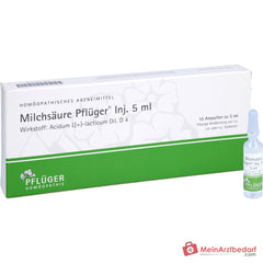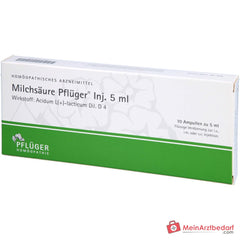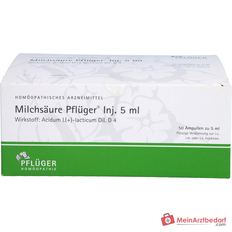 Milchsäure Pflüger Inj. 5 ml, Flüssige Verdünnung zur Injektion. Wirkstoff: Acidum L(+)-lacticum Dil. D 4. Anwendungsgebiete: Registriertes homöopathisches Arzneimittel, daher ohne Angabe einer therapeutischen Indikation.