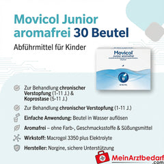Der Name dieses Arzneimittels ist Movicol Junior aromafrei 69 g Pulver zur Herstellung einer Lösung zum Einnehmen. Es handelt sich um ein Arzneimittel aus der Gruppe der Abführmittel (Laxanzien) zur Behandlung von chronischer Verstopfung bei Kindern im Alter von 1 bis 11 Jahren und zur Behandlung von einer hartnäckigen Verstopfung mit Kotstauung im Darm Koprostase genannt bei Kindern zwischen 5 und 11 Jahren.
