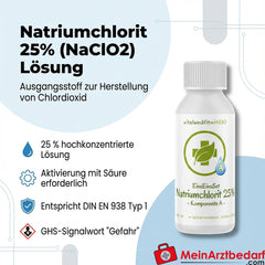 Lieferumfang: 1 Flasche Natriumchlorit 25 % (NaClO2), 100 ml, HDPE‑Tropfflasche mit kindersicherem Tropfverschluss Hersteller: Vitalundfitmit100