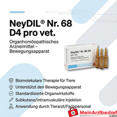 NeyDIL Nr. 68 D4 pro vet ist ein apothekenpflichtiges organhomöopathisches Arzneimittel zur unterstützenden Behandlung von Beschwerden des Bewegungsapparates bei Tieren. Basierend auf biomolekularer Therapie dient es der Regulation physiologischer Prozesse und wird ausschließlich subkutan oder intramuskulär durch Tierärzte oder qualifiziertes Fachpersonal verabreicht.