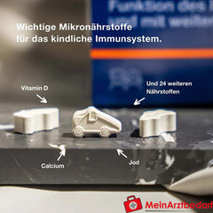 Orthomol Junior C plus sind Kautabletten mit Mandarine/Orangen-Geschmack zur ergänzenden Versorgung von Kindern ab 4 Jahren mit wichtigen Vitaminen und Mineralstoffen. Die Formulierung unterstützt das normale Immunsystem und die altersgerechte Knochenentwicklung im Rahmen einer ausgewogenen Ernährung.