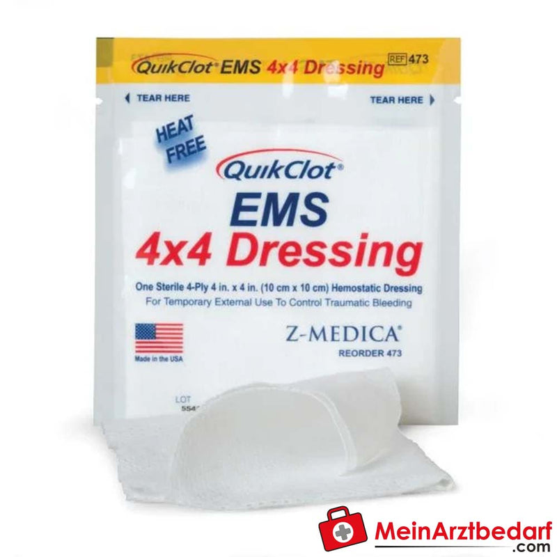 Lieferumfang: 1 Stk. QuikClot EMS Wundauflage 10,16 × 10,16 cm, steril (einzeln verpackt, Zeolith-Technologie)