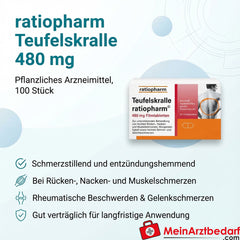 Lieferumfang: 100 ratiopharm Teufelskralle 480 mg Filmtabletten – Hersteller: ratiopharm