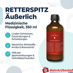 RETTERSPITZ Äußerlich ist eine medizinische Flüssigkeit zur äußerlichen Anwendung zur vorübergehenden Linderung von Beschwerden des Bewegungsapparates. Die milchig-trübe Lösung enthält kombinierte natürliche Wirkstoffe mit kühlender und entzündungshemmender Wirkung und eignet sich zur lokalen Anwendung auf Umschlägen und Wickeln.