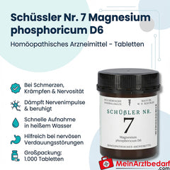 Lieferumfang: 1.000 Tabletten Schüssler Nr. 7 Magnesium phosphoricum D6, schnell lösliche Tabletten.