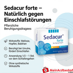Lieferumfang: 1 Packung Sedacur forte (75 mg Baldrianwurzel‑Trockenextrakt, 45 mg Melissenblätter‑Trockenextrakt, 23 mg Hopfenzapfen‑Trockenextrakt) Dragees