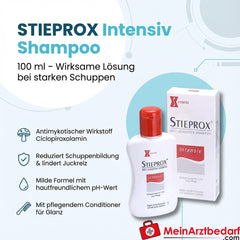 STIEPROX Intensiv Shampoo mit dem Wirkstoff Ciclopiroxolamin ist für die Behandlung starker Schuppen und schuppender Kopfhaut konzipiert. Die antimykotische Formel reduziert schuppenverursachende Pilze, lindert Juckreiz und beruhigt die Kopfhaut bei regelmäßiger Anwendung.