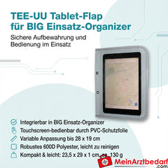 Der TABLET-FLAP wird per Klett auf dem Einsatz-Organizer befestigt und passt sich handelsüblichen Tablets bis 28 x 19 cm an. Die sensitive PVC-Schutzfolie ermöglicht Bedienung ohne Entnahme. Zur Reinigung feucht abwischen; nicht mit scharfen Lösungsmitteln behandeln.