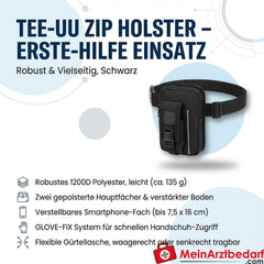 Das ZIP Holster dient zur geordneten Aufbewahrung von Erste-Hilfe-Materialien und Einsatzwerkzeug. Vor Gebrauch prüfen, regelmäßig reinigen und beschädigte Teile ersetzen. Keine Medizinprodukt-Angaben vorhanden; bei Unsicherheiten fachlichen Rat einholen.