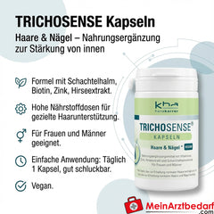 Trichosense Kapseln unterstützen die Haarpflege von innen mit einer Kombination aus Schachtelhalm (organisches Silicium), Biotin und Zink. Die Rezeptur enthält Hirseextrakt und B‑Vitamine in hohen Dosierungen und ist für Frauen und Männer geeignet.