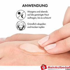 Morgens und abends auf das angefeuchtete Gesicht auftragen, einmassieren bis feiner Schaum entsteht und gründlich abspülen; Augenpartie aussparen. Bei Irritationen Anwendung reduzieren oder abbrechen. Lesen Sie die Packungsbeilage; bei anhaltenden Problemen ärztlichen Rat einholen.