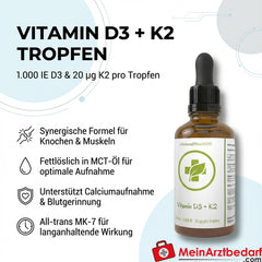 Flüssige Kombination aus Vitamin D3 (1.000 IE) und Vitamin K2 MK‑7 (20 µg) pro Tropfen zur täglichen Ergänzung. Fettlösliche Formulierung in MCT‑Öl für eine verbesserte Aufnahme; geeignet für die Unterstützung von Knochen- und Muskelfunktionen sowie des Calciumstoffwechsels.