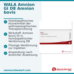 Amnion GI D8, Flüssige Verdünnung zur Injektion. Wirkstoff: Amnion bovis GI. Anwendungsgebiete: Homöopathisches Arzneimittel der anthroposophischen Therapierichtung, daher ohne Angabe einer therapeutischen Indikation.