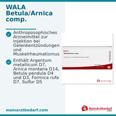 Betula/Arnica comp., Flüssige Verdünnung zur Injektion. Anwendungsgebiete: Gemäß der anthroposophischen Menschen- und Naturerkenntnis. Dazu gehören: Gelenkentzündungen (Akute Arthritiden) auf rheumatischer und degenerativer Grundlage, Muskelrheumatismus, Erkrankung der Gelenkumgebung (Periarthropathie).