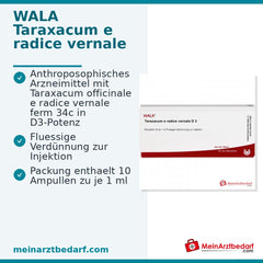 Taraxacum e radice (vernale) D3, Flüssige Verdünnung zur Injektion. Wirkstoff: Taraxacum officinale e radice (vernale) ferm 34c. Anwendungsgebiete: Homöopathisches Arzneimittel der anthroposophischen Therapierichtung, daher ohne Angabe einer therapeutischen Indikation.