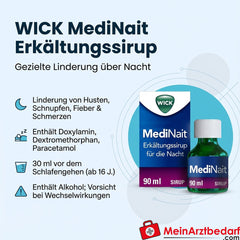 • WICK MediNait Erkältungssirup für die Nacht – gezielte Linderung von Husten, Schnupfen, Fieber und Schmerzen über Nacht.